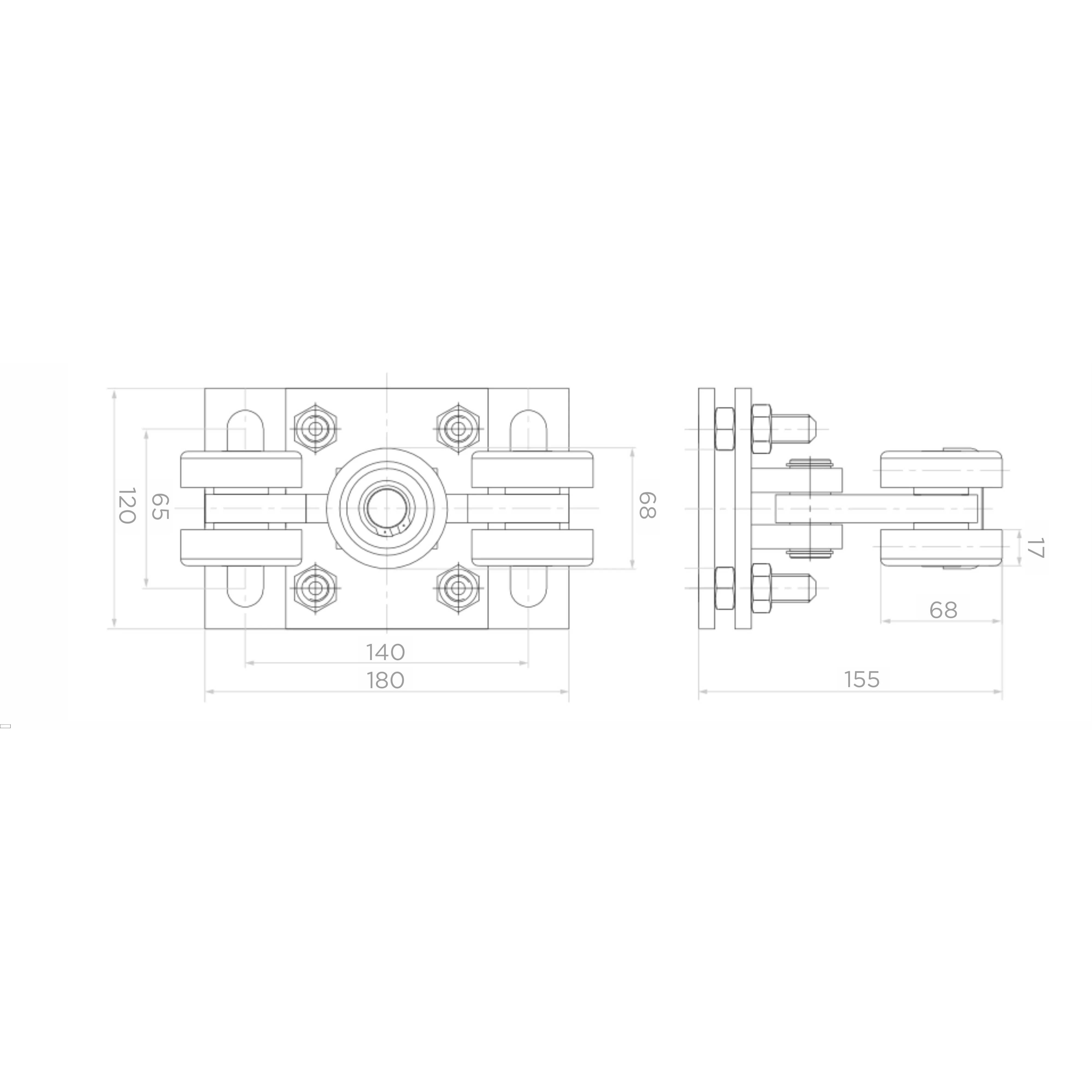 A 180×120 mm méretű szerelőtalp hosszúkás nyílásokkal (18×39 mm) rendelkezik, amelyek megkönnyítik a futókocsi pozíciójának beállítását az alaphoz való rögzítés során. A görgők tengelytávolsága 140 mm a hossztengelyen és 68 mm a kereszttengelyen, a futókocsi teljes mélysége görgőkkel együtt 155 mm.