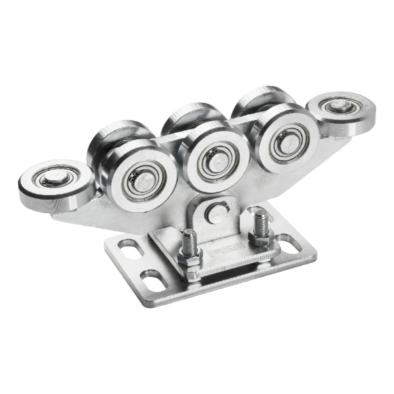 A futókocsi szerkezete horganyzott, ami kiváló korrózióállóságot és hosszú élettartamot biztosít külső körülmények között is. A futókocsi csavarokkal rögzíthető az alaplaphoz — az alaplap szerelőnyílásokkal rendelkezik a gyors és biztonságos rögzítés érdekében. A szimmetrikusan elrendezett 8 görgő egyenletes terheléselosztást és stabil kapuvezetést biztosít a sínen.