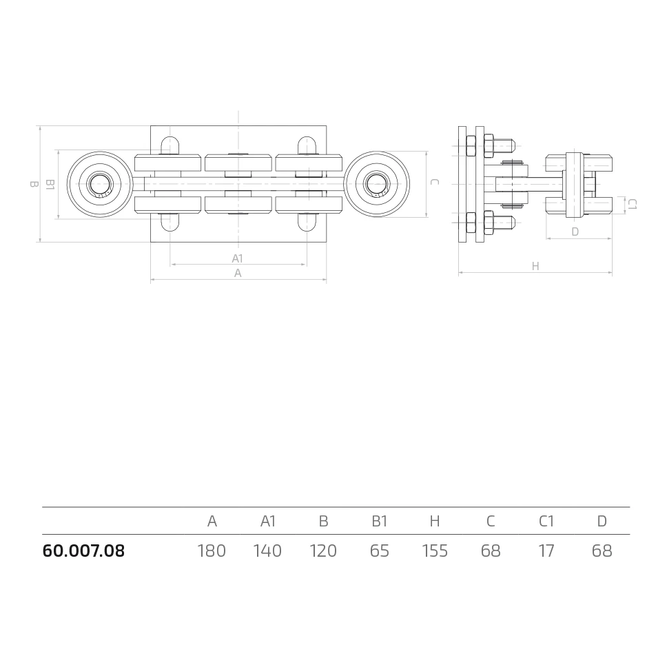 A futókocsi 80×80×5 mm-es futósínnel való együttműködésre készült — ez a nagy teherbírású tolókapu-rendszerekben alkalmazott szabványos profil. A kompakt kialakítás és a gördülő elemek precíz megmunkálása gyors szerelést és karbantartásmentes üzemeltetést tesz lehetővé.